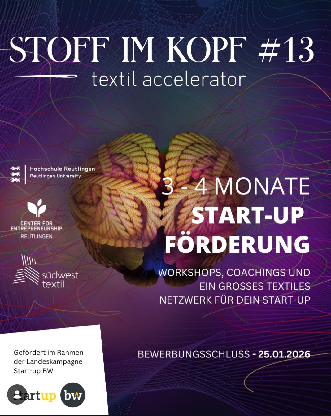 Für 3–4 Monate erhalten die Teilnehmenden von Stoff im Kopf an der Hochschule Reutlingen professionellen Input von erfahrenen Coaches & Mentor*innen rund um textile Start-ups und aktuelles Know-how aus der Textilbranche.
