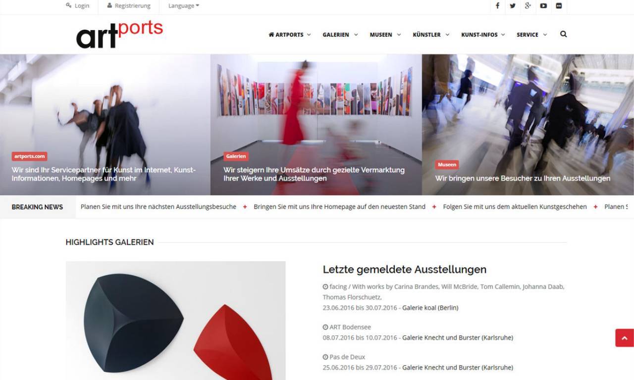 Mit über 8.000 gelisteten Galerien, Museen und Kunstinstitutionen weltweit zählt artports.com zu den größten Kunstportalen. Eine weitere Besonderheit von artports.com ist das breite Angebot an Serviceleistungen für Galerien, Museen, Kunstinstitutionen und Künstler im Bereich des Internetauftritts: als Spezialist für Kunstwebseiten bietet das Unternehmen maßgeschneiderte Lösungen für diesen Bereich.