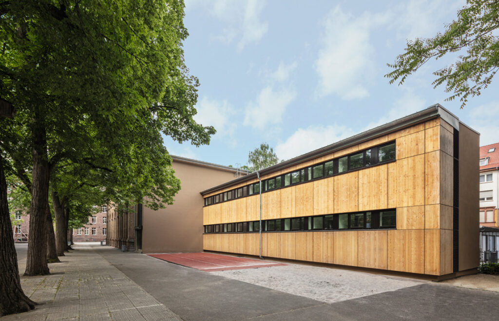 Im Zuge einer Kernsanierung des Umkleidetrakts wurde auch die bestehende, ungedämmte Fassade grundlegend erneuert. Die Vorgabe des Bauherrn war klar: ökologische, natürliche Materialien, die sich zurückhaltend in den gewachsenen Schulkomplex einfügen.