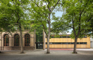 Im Treppenhaus ersetzt eine neue Pfosten-Riegel-Verglasung die alten Holzfenster. Ein markantes Vordach mit gefrästem Aluminium-Schriftzug akzentuiert den Eingang. Ein neues Farbkonzept fasst das heterogene Gebäudeensemble zu einem harmonischen Gesamtbild zusammen.