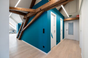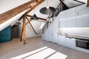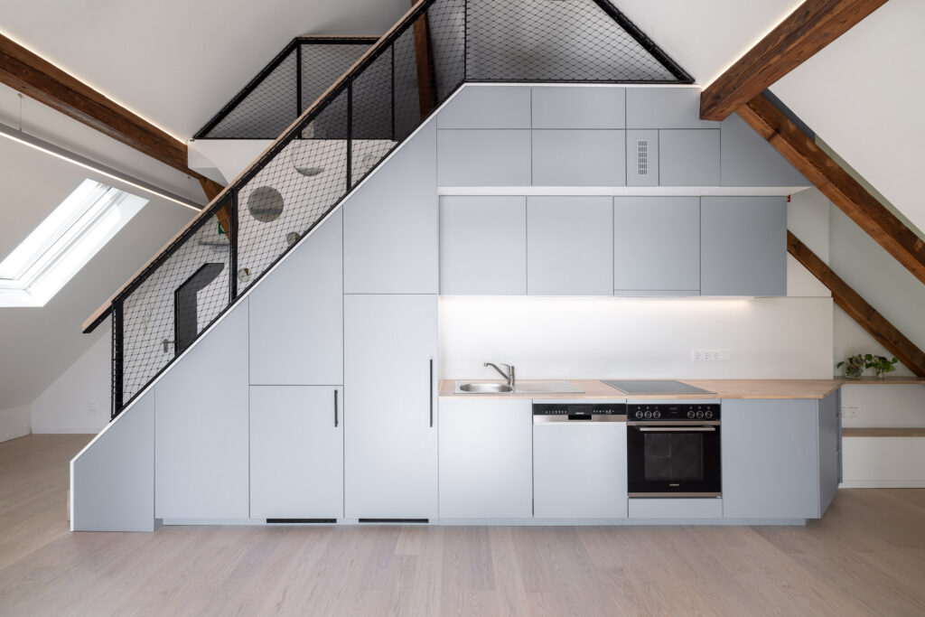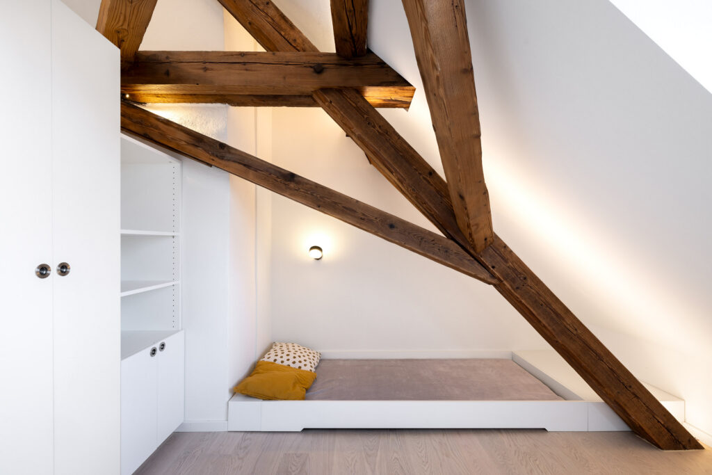 Aus dem dunklen Dachraum entstanden helle, individuelle Räumlichkeiten, die den historischen Charakter des Gebäudes erhalten und erlebbar machen. Einzelzimmer, Büro, Sanitärräume und ein offener Sozialbereich mit Küche wurden geschickt in die anspruchsvolle Kubatur des Dachstuhls integriert. Neue Gauben und Dachflächenfenster, in enger Abstimmung mit dem Denkmalamt entwickelt, öffnen den Aufenthaltsbereich in die Baumkronen des Gartens und bieten einen weiten Blick zum Turmberg.