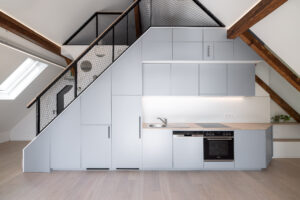 Der sandgestrahlte und farblos lackierte Dachstuhl gibt den Räumen ihren unverwechselbaren Charakter. Als besonderes Element formt die Küche zugleich den Treppenaufgang zur Empore, die den Kindern als Rückzugsort dient. Fliesen, Parkettböden und unterschiedliche Blautöne vervollständigen das Raumkonzept.