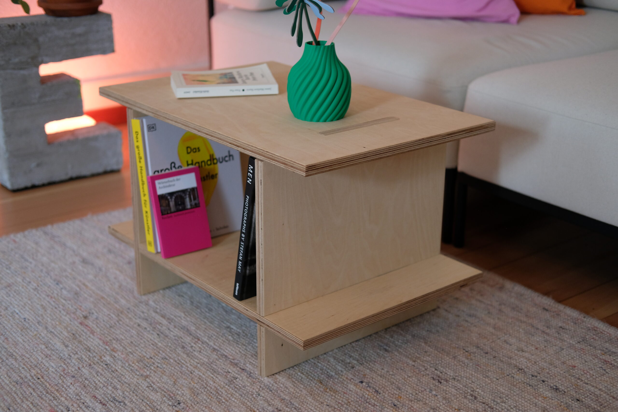 Dieser Couchtisch besteht aus vier präzise gefertigten Elementen, die sich ohne Schrauben oder Beschläge zu einer stabilen Einheit fügen. Die Konstruktion folgt einem klaren Prinzip: einfache Verbindung, klare Form, ruhige Proportion.
