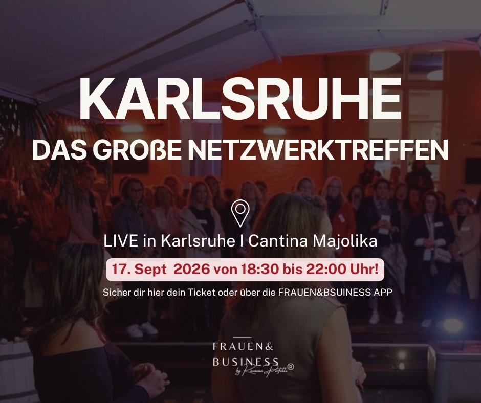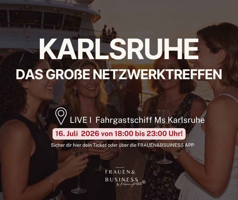 Über die VeranstaltungZum ersten Mal verlegen wir unser FRAUEN&BUSINESS Netzwerktreffen auf ein Schiff – in Kooperation mit dem Rheinhafen Karlsruhe. Dich erwartet ein exklusiver Abend auf dem Wasser mit Sonnenuntergang, Blick über den Rheinhafen, inspirierenden Begegnungen und Live-Musik.Dieses Event richtet sich an alle Frauen, Selbständige, Unternehmerinnen und Führungskräfte sowie Business-Interessierte! Unsere großen Netzwerktreffen finden 3 Mal im Jahr statt. Hier geht es um einen austauschreichen Abend mit tollen Gesprächen und leckeren Cocktails. Es dürfen auch gerne Freundinnen, Kolleginnen und Geschäftspartnerinnen eingeladen werden. Ablauf am 16. Juli18:00 Uhr – Boarding & AnkommenCheck-in am Rheinhafen Karlsruhe, Boarding des Schiffs und entspanntes Ankommen.19:00–21:00 Uhr – Netzwerken auf dem WasserPünktlich um 19:00 Uhr legen wir ab.Kurze Begrüßung durch FRAUEN&BUSINESSImpuls zum EinstiegOffenes Netzwerken auf dem Deck und im InnenbereichSommerabend-Atmosphäre & Sonnenuntergang über dem RheinhafenWährend der Fahrt hast du genügend Zeit für neue Kontakte, Austausch und inspirierende Gespräche.ab 21:00 Uhr – After Work & Live-MusikUm 21:00 Uhr kehren wir zum Rheinhafen zurück – und der Abend geht nahtlos in ein After-Work-Event über.Mit dabei: Amy Sue & Friends, die mit ihrer Live-Musik für Stimmung sorgen. Es wird getanzt, gelacht und gefeiert. Hinweise:Tickets: Die Teilnehmerzahl ist auf 200 Frauen begrenzt.Inklusive: Schifffahrt & Essen.Getränke sind vor Ort an der Bar zu bezahlen (Karten- und Barzahlung möglich)Mit der Anmeldung des Events bestätigst du den Erhalt unseres Newsletters. Jeden Montag um 8:30 Uhr absoluten Mehrwert für dein Business und eine Übersicht aller anstehenden Events.Bei der Veranstaltung werden Fotos und Videos aufgenommen, die zu Marketingzwecken verwendet werden können. Mit der Anmeldung und der Teilnehme am Event bestätigst du die Verwendung der Foto- und Videomaterialien.