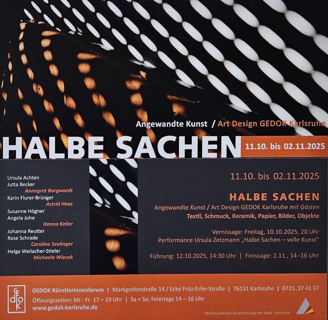 Die Mitglieder der Gruppe Angewandte Kunst und ihre Gastkünstlerinnen werden Sie mit unterschiedlichen, witzigen und gedanklich verschlungenen Bezügen zu HALBEN SACHEN erstaunen und Ihnen kreative Ergänzungen anbieten.