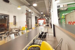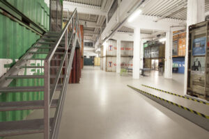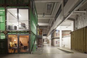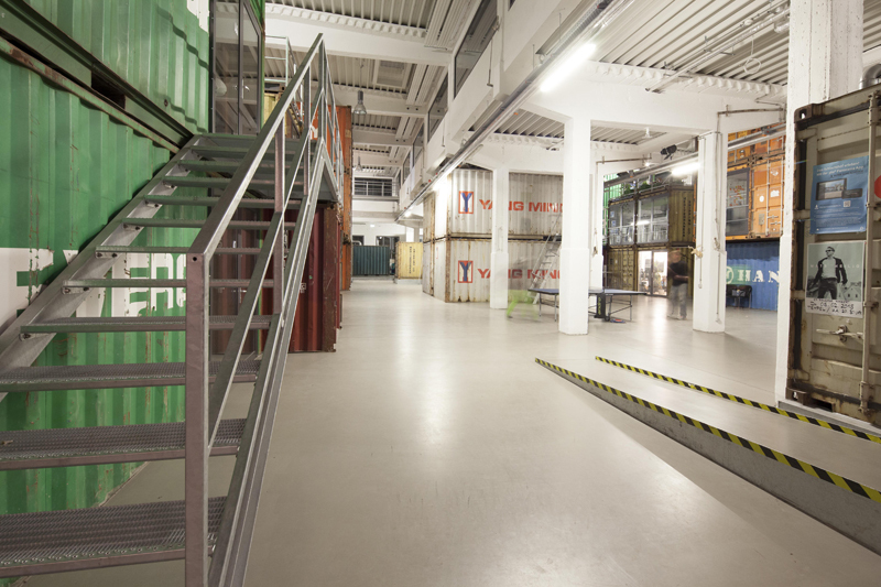 Ein Container ist ca. 13 m2 groß, insgesamt können bis zu 3 Container pro Nutzer*in angemietet werden. Die Container sehen noch genauso aus, wie sie vom Schiff kamen, lediglich Fenster und Türen wurden eingebaut und die Innenwände weiß gestrichen. Die Container besitzen Steckdosen sowie einen Telefon- und Internetanschluss. Die Nutzer*innen können ihren angemieteten Container nach den eigenen Wünschen einrichten. Nur die Wände anbohren geht leider nicht.