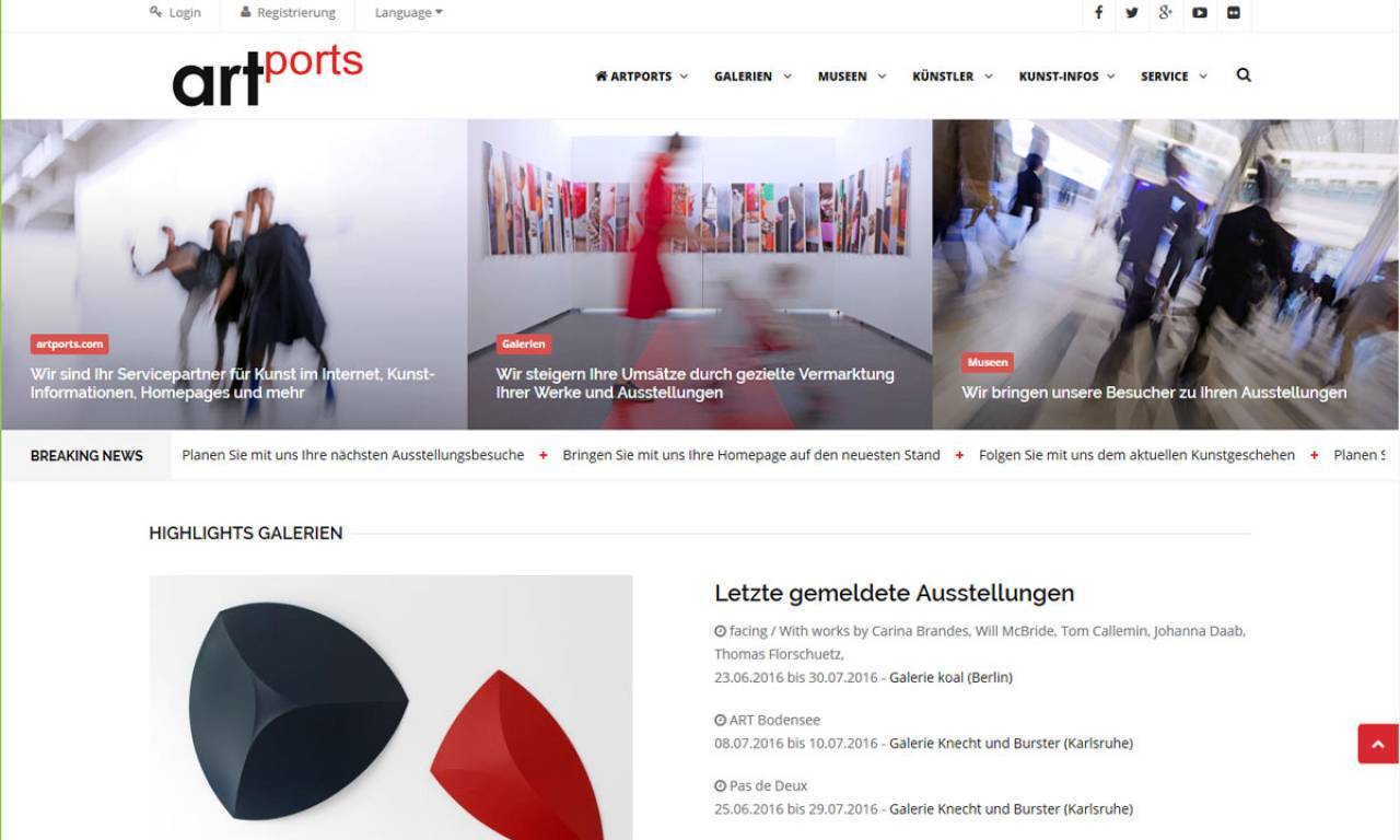 Mit über 8.000 gelisteten Galerien, Museen und Kunstinstitutionen weltweit zählt artports.com zu den größten Kunstportalen. Eine weitere Besonderheit von artports.com ist das breite Angebot an Serviceleistungen für Galerien, Museen, Kunstinstitutionen und Künstler im Bereich des Internetauftritts: als Spezialist für Kunstwebseiten bietet das Unternehmen maßgeschneiderte Lösungen für diesen Bereich.