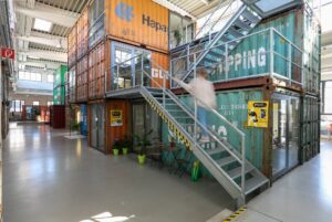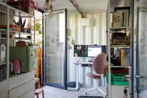 Ein Container ist ca. 13 m2 groß, insgesamt können bis zu 3 Container pro Nutzer*in angemietet werden. Die Container sehen noch genauso aus, wie sie vom Schiff kamen, lediglich Fenster und Türen wurden eingebaut und die Innenwände weiß gestrichen. Die Container besitzen Steckdosen sowie einen Telefon- und Internetanschluss. Die Nutzer*innen können ihren angemieteten Container nach den eigenen Wünschen einrichten. Nur die Wände anbohren geht leider nicht.