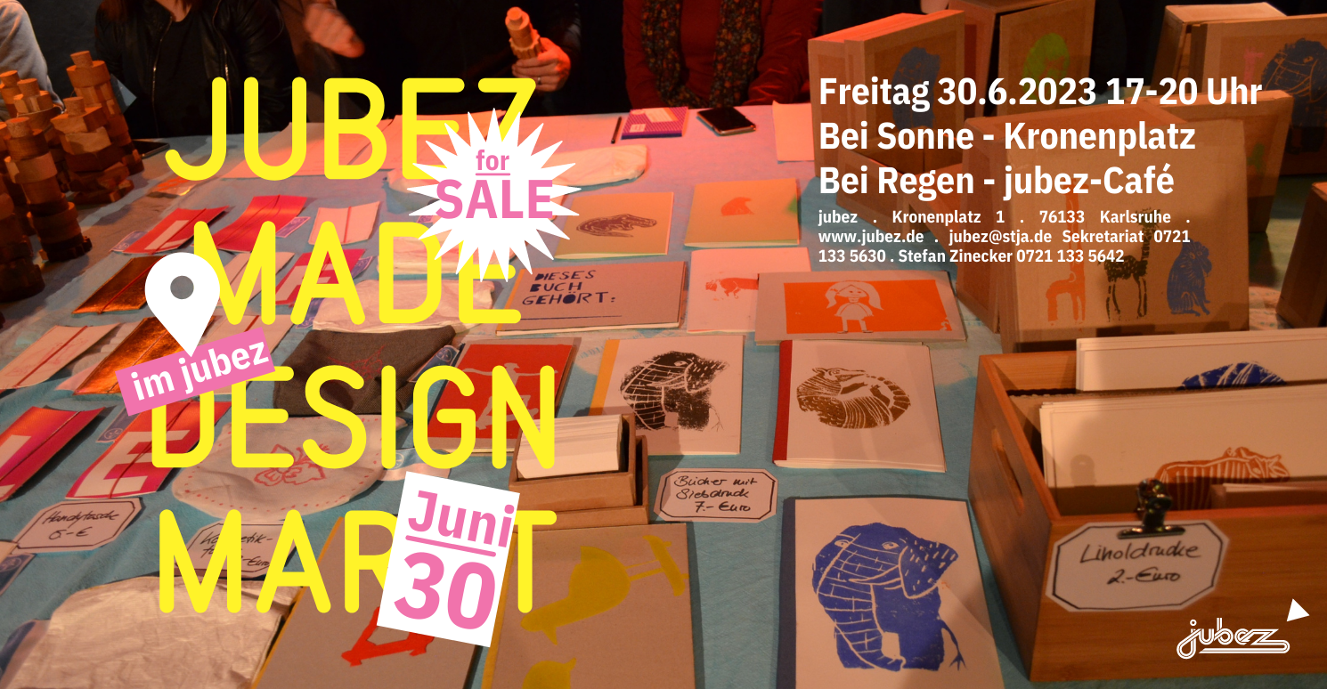 jubezmade – das ist der Designmarkt des jubez mit Musik, Drinks und Mitbringbuffet. Hier wird Design und Upcycling kleinerer und größerer Labels gezeigt, verkauft und getauscht. Unter dem Label „supercraftproducts – jubezmade“ wird Selbstdesigntes aus den jubez Werkstätten gezeigt.