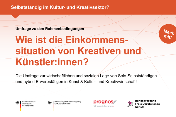 Selbstständig im Kultur- und Kreativsektor? Umfrage zu den Rahmenbedingungen. Eure Mitwirkung ist gefragt! Das Bundesministerium für Wirtschaft und Klimaschutz (BMWK) und die Beauftragte der Bundesregierung für Kultur und Medien (BKM) haben die Prognos AG und den Bundesverband Freie Darstellende Künste e. V. (BFDK) damit beauftragt, die Rahmenbedingungen von Soloselbständigen und hybrid Erwerbstätigen in der Kultur- und Kreativwirtschaft (KKW), dem öffentlichen Kulturbetrieb und Kulturberufen in Deutschland zu untersuchen. Dafür braucht es Eure Antworten u.a. zu Eurer wirtschaftlichen und sozialen Lage und zur Kunst- und Kulturförderung. Die Umfrage läuft bis zum 8. März 2024. Nehmt an der Umfrage teil, um ein umfassendes Bild der Situation aller Sparten und Branchen von Kreativ- und Kunstschaffenden zu zeichnen und dort, wo es nötig ist, Verbesserungen herbeizuführen. Die Umfrage dauert etwa eine halbe Stunde. Die Befragung läuft bis zum 8. März 2024. Hier geht es zur Umfrage: Selbstständig im Kultur- und Kreativsektor? Umfrage zu den Rahmenbedingungen
