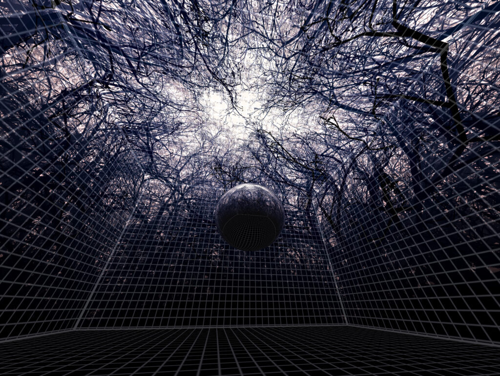 Im Zentrum des Raums steht eine vor Berührungen geschützte Spiegelkugel, die das Licht eines Projektors in den gesamten Raum spiegelt. Das reflektierte Licht des Spiegels wirft sich bewegende Pflanzen eines Dickichts auf Wände und Decke. Beim Betreten der Installation findet man sich also in einem unbekannten Schlupfwinkel in den Wäldern wieder. Während die Pflanzen Schutz suggerieren, erzählen die Klänge des Raumes eine andere Seite der Geschichte. Geräusche der Umgebung und Wind, der durch die Bäume weht, erzeugen eine Situation, die in der Schwebe ist und bei der man nicht sicher sein kann, dass alles in Ordnung ist. Die Besucher*innen können mit den Pflanzen interagieren. Je mehr sie sich bewegen, desto lauter und unheimlicher wird die äußere Klanglandschaft.