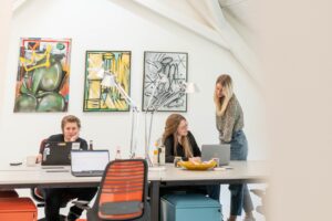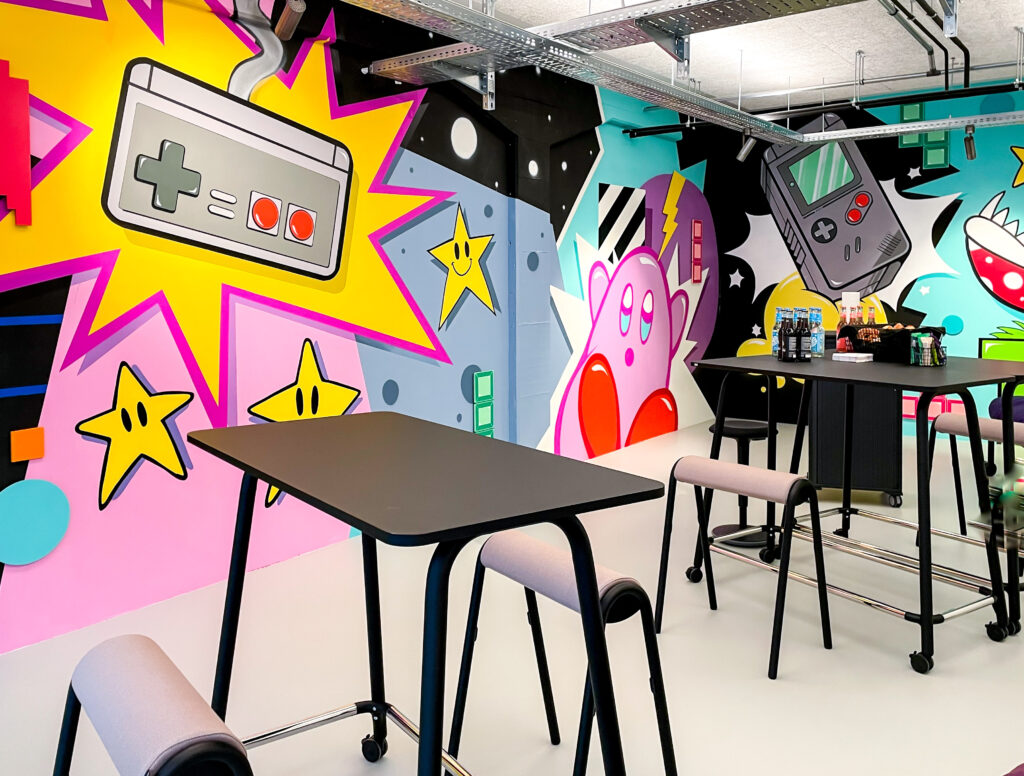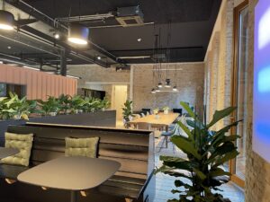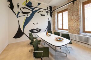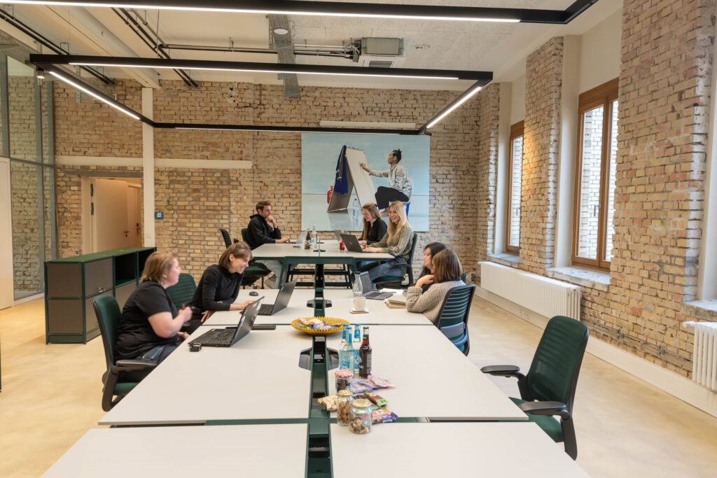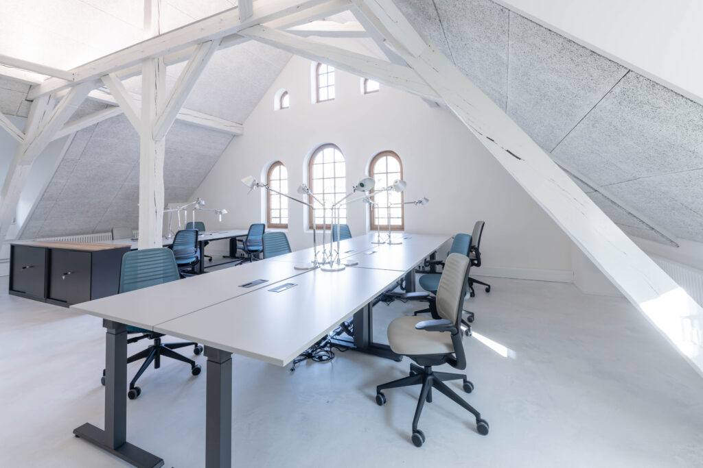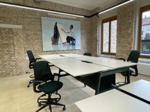 Wir haben diese nach den Bedürfnissen der heutigen Arbeitswelt ausgerichtet. Hierunter finden sich beispielsweise speziell ausgestattete Workshopräume mit mobilem Mobiliar und Gestaltungsflächen, wie magnetischen Wänden, die sich optimal für kollaborative Prozesse und Design Thinking Workshops eignen. Für hybride oder digitale Meetings und Konferenzen haben wir verschiedene Räume mit neuester technologischer Ausstattung versehen. Der große Veranstaltungsraum ‚Hall‘ eignet sich mit einem 3x3 m großen LED-Screen, zwei zusätzlichen Präsentationsbildschirmen und dem Sound- und Videokonferenzsystem nicht nur für hybride Konferenzen, sondern bietet auch vielseitige Möglichkeiten für Kunst- und Kulturveranstaltungen mit bis zu 200 Personen.