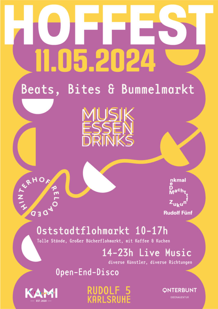 Für den gemeinnützigen Verein Rudolf5 / KAMI sponserten wir Konzept & Grafik für das Hoffest am 11.05.2024. Nach der langen Baustellenphase gibt es endlich wieder ein Hoffest unter dem Motto:
