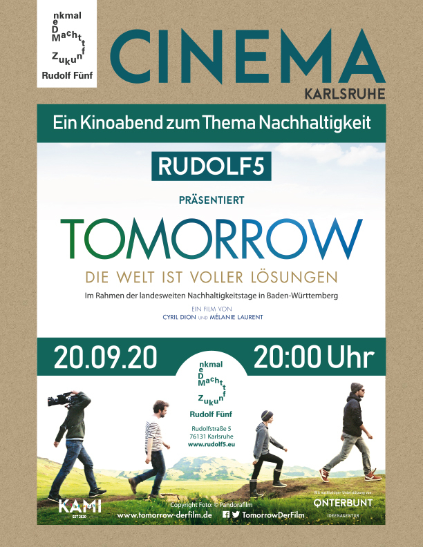 Am Sonntag, den 20. September 2020 um 20 Uhr findet bei uns im kreativen Hinterhof-Areal Rudolf 5 ein Kinoabend zum Thema Nachhaltigkeit statt. Im Rahmen der landesweiten Nachhaltigkeitstage vom 18 bis 21. September 2020 präsentieren wir auf einer #secondhand Großleinwand den Kinofilm „Tomorrow“ - Die Welt ist voller Lösungen ab 20:00 Uhr (Einlass ab 19:00 Uhr). Die Teilnehmerzahl ist auf max. 100 Personen begrenzt. Eintritt: 5€ Spendenempfehlung. Denkt bitte an eure Masken und genügend Abstand!