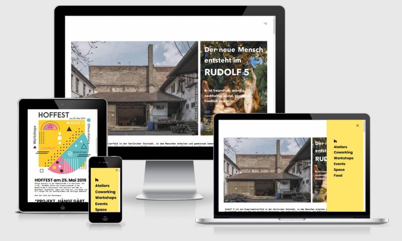 Rudolf 5 ist ein Experimentierfeld in der Karlsruher Oststadt, in dem Menschen arbeiten und gemeinsam leben. Rudolf 5 versteht sich als Ort des kreativen Prozesses, der kulturellen Produktion und Reflexion, sowie des sozialen Miteinanders. Es braucht Veränderung für einen neuen Lebensentwurf, der Mensch muss sich verändern. Das denkmalgeschützte Ensemble geht in die Zukunft und möchte ein mögliches Lebensmodell entwerfen und erlebbar machen. Klima, Umwelt und soziale Herausforderungen erfordern ein Umdenken. In öffentlichen und privaten Räumen wird themenübergreifend an diesem Entwurf gearbeitet. Es gibt Werkstätten und Entwurfsstätten. Synergien sollen Nachhaltigkeit und Soziales digital und analog verknüpfen.