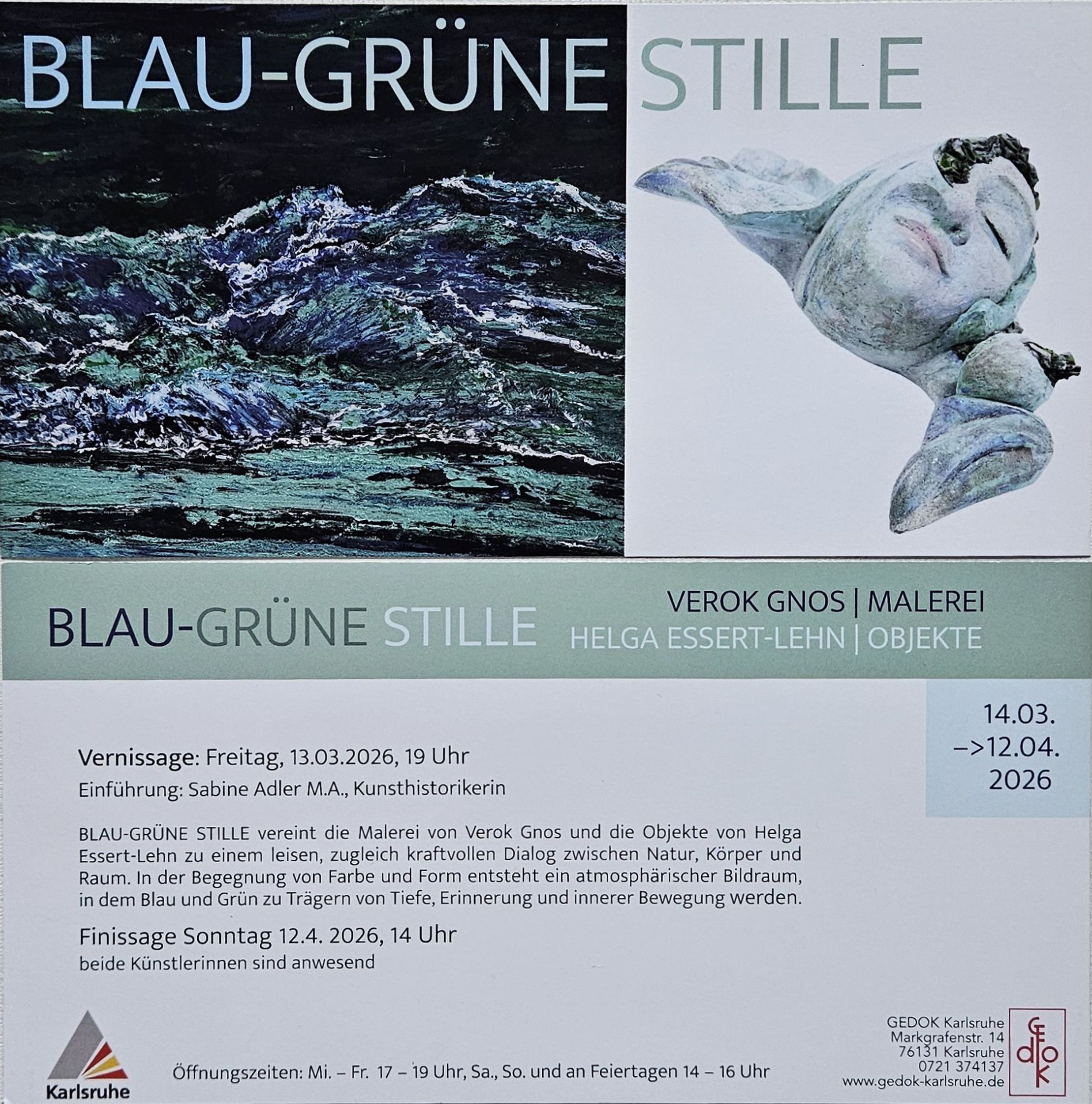 Vernissage am Freitag, 13.03.2026 um 19 Uhr Einführung: Sabine Adler M. A., Kunsthistorikerin Finissage am Sonntag, 12.04.2026 um 14 Uhr Beide Künstlerinnen sind anwesend BLAU-GRÜNE STILLE vereint die Malerei von Verok Gnos und die Objekte von Helga Essert-Lehn zu einem leisen, zugleich kraftvollen Dialog zwischen Natur, Körper und Raum. In der Begegnung von Farbe und Form entsteht ein atmosphärischer Bildraum, in dem Blau und Grün zu Trägern von Tiefe, Erinnerung und innerer Bewegung werden. Die Malereien von Verok Gnos entspringen unmittelbar der Kraft der Farbe. Ihre Landschaften entstehen aus dem Erleben der Natur. Sie sind inspiriert von den Lichtphänomenen des Himmels und den grünen und blauen Reliefs der Landschaft. Ihre Werke machen sichtbar, was zwischen Licht und Dunkelheit, Wahrnehmung und Gefühl liegt. Helga Essert-Lehn nähert sich in ihren plastischen Werken dem Zwischenraum von Figur und Natur. Ihre Serie „Zwischen Wesen und Weite“ folgt einer organischen Bewegung, die an Pflanzenwachstum erinnert. Dabei vermischen sich menschliche, tierische und pflanzliche Formgebung. Aus Beton, Metall oder Textilien entstehen taktile, feinsinnige Formen, die Geschichten von Wandel und stillem Wachstum erzählen.