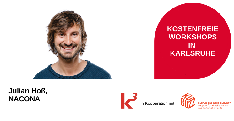 Der Workshop findet in Kooperation zwischen dem K³ Kultur und Kreativwirtschaftsbüro der Stadt Karlsruhe und KUBUZZ, dem Weiterbildungs- und Coachingprogramm in Baden-Württemberg für freie Künstler*innen und Kulturschaffende aller Sparten, statt. KUBUZZ wird federführend vom Institut für Kulturmanagement der Pädagogischen Hochschule Ludwigsburg im Verbund mit weiteren Partnern durchgeführt. Alle Angebote sind kostenfrei, da sie durch den Europäischen Sozialfonds (ESF) gefördert werden. Das Programm findet sowohl digital als auch vor Ort an weiteren Standorten in Baden-Württemberg statt. Die Veranstaltungen finden unter Einhaltung der aktuell geltenden Corona-Verordnung des Landes statt.