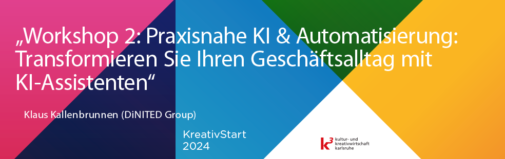 Im Rahmen des KreativStart Kongresses finden jedes Jahr auch Workshops zur Vertiefung aktueller Themen statt. In diesem interaktiven Workshop 2 führt euch Klaus Kallenbrunnen durch die Grundlagen und fortgeschrittenen Strategien der angewandten Künstlichen Intelligenz (KI) und Automatisierung, speziell zugeschnitten auf unternehmerische Prozesse. Beginnend mit einem kompakten "How to"-Input, werden essenzielle Werkzeuge und Methoden abgedeckt, um eure Geschäftsprozesse effizienter zu gestalten. Anschließend arbeiten wir in hands-on Sessions direkt an der Implementierung von KI-gesteuerten Lösungen für eure Unternehmen. Ihr erhaltet individuelle Beratung und Unterstützung, um Automatisierungstechniken nahtlos in euren Arbeitsalltag zu integrieren und Prozessautomatisierung zu modellieren. Verlasst den Workshop mit konkreten Lösungsansätzen und dem Wissen, wie ihr KI- und Automationstools zur Steigerung eurer Geschäftseffizienz nutzen könnt.